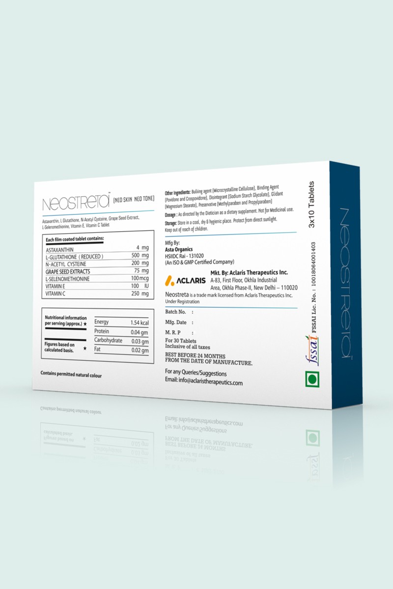 NEOSTRETA TABLETS- Neostreta tablets is the most powerful skin lightening complex. Consisting L-Glutathione, Astaxanthin and other strong antioxidants to bring NEW LIFE to your skin.
