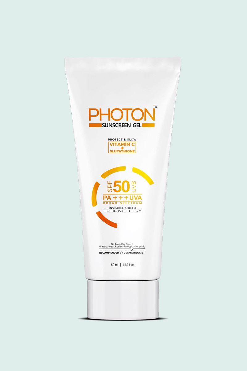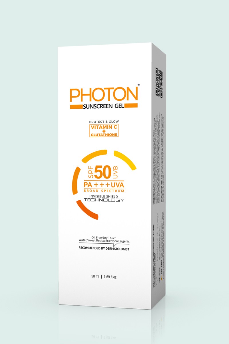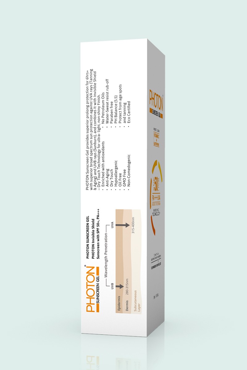 PHOTON SUNSCREEN GEL- A sunscreen enriched with powerful antioxidants and INVISIBLE SHIELD TECHNOLOGY. It protects from UVA and UVB radiations which are responsible for ageing and sunburn respectively.